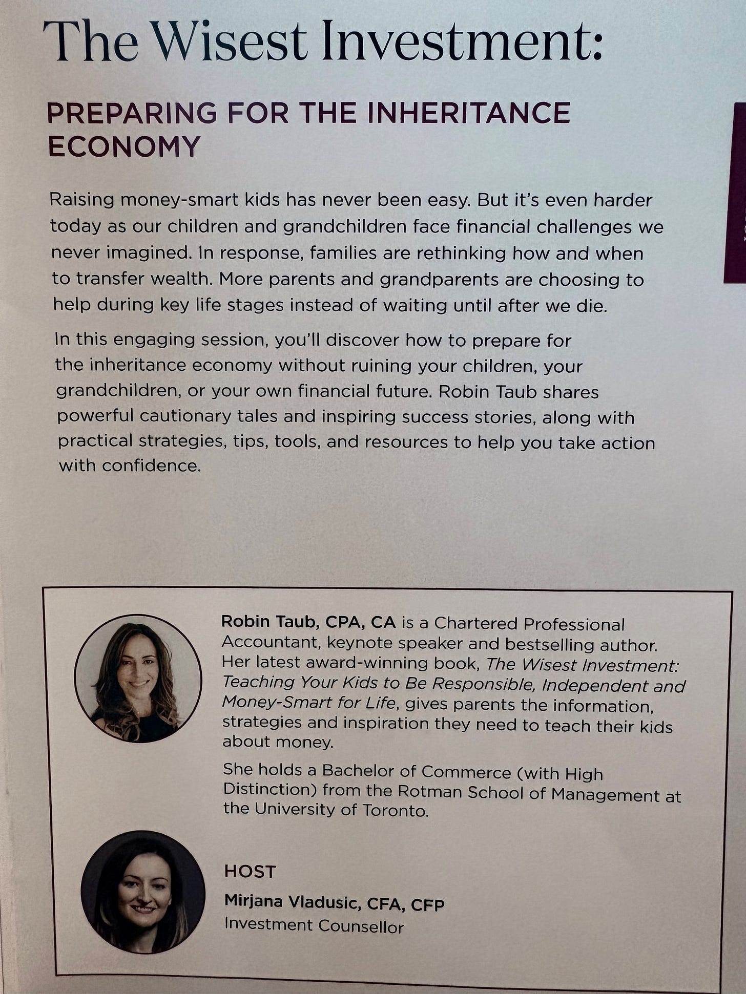 Crafting a transformational speech always takes time and effort and I wanted my session to be more than just informative. It had to be “an experience” for the audience, something you can’t get by asking ChatGPT about the Inheritance Economy! (But if you did, it might tell you that over the next 20 years, $2 trillion in wealth will change hands in Canada and $70 trillion will be passed along in the US. In the Inheritance Economy, access to inherited wealth will increasingly shape opportunities and life outcomes. Hard work alone may no longer guarantee the same rewards it once did.)